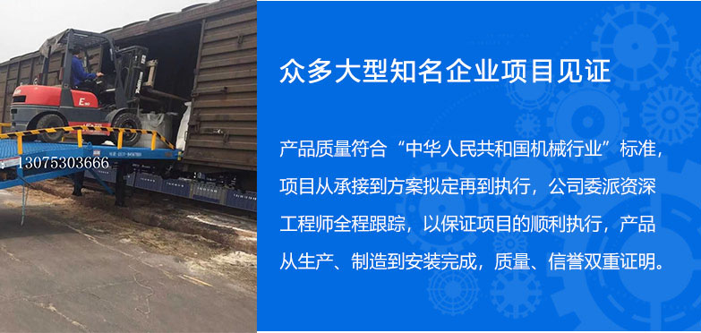 >> 13年的登車(chē)橋設(shè)備制造經(jīng)驗(yàn) 集設(shè)計(jì)、研發(fā)、生產(chǎn)和銷(xiāo)售于一體的制造型企業(yè),專業(yè)制造液壓登車(chē)橋,移動(dòng)式登 車(chē)橋和高空作業(yè)平臺(tái),經(jīng)驗(yàn)豐富,擁有強(qiáng)大的成產(chǎn)技術(shù)和完善的管理模式。 >> 引進(jìn)國(guó)際先進(jìn)施工工藝 配備整套專業(yè)自動(dòng)化生成設(shè)備,引進(jìn)國(guó)外先進(jìn)技術(shù), 定期培訓(xùn),確保設(shè)備的高品質(zhì)。 產(chǎn)品具有設(shè)計(jì)新穎、結(jié)構(gòu)合理、升降平穩(wěn)、載重安全、操作簡(jiǎn)單、維護(hù)方便等優(yōu)點(diǎn)。